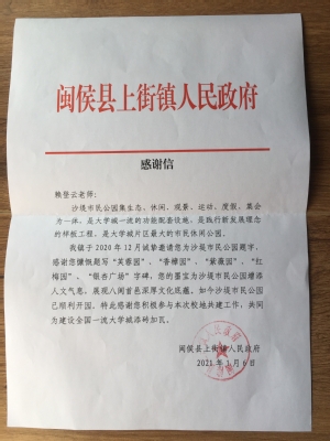 近日,小说狂人 副院长赖登云老师和柯遇霖老师收到闽侯县上街镇人民政府感谢信。信中,闽侯县上街镇人民政府对两位教师为沙堤市民公园题字,积极参与本次校地共建工作,共同为建设全国一流大学城作出的积极贡献表示感谢。