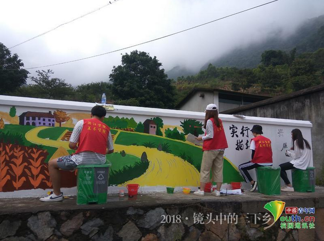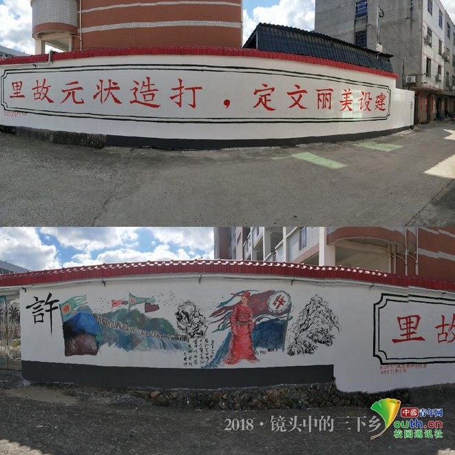 的暑期社会实践队队员们运用自己的专业知识和双手,在用时不到四天的时间里完成的,一共完成了约有500米长的墙面,近1500平方米的面积。