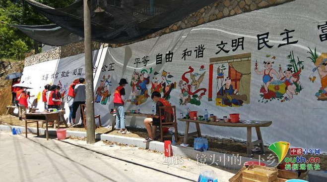 的大学生们创新形势,融文明礼仪于图画,融红色教育于艺术,绘出了一幅幅有特色、有高度、有内涵的主题文化墙,不仅美化了村容村貌,更是传递了乡风文明新风尚,为建设“美丽乡村”注入了新活力。