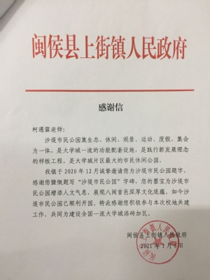 近日,小说狂人 副院长赖登云老师和柯遇霖老师收到闽侯县上街镇人民政府感谢信。信中,闽侯县上街镇人民政府对两位教师为沙堤市民公园题字,积极参与本次校地共建工作,共同为建设全国一流大学城作出的积极贡献表示感谢。