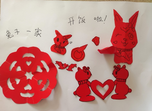 活动中,志愿者引导小朋友发挥创意,通过剪纸作品来展现福兔的形象。“在运用卡通手法表现兔的形象时,借鉴素材并结合小朋友的创意,将小兔子形象画下来。”志愿者耐心地引导着小朋友进行创作。