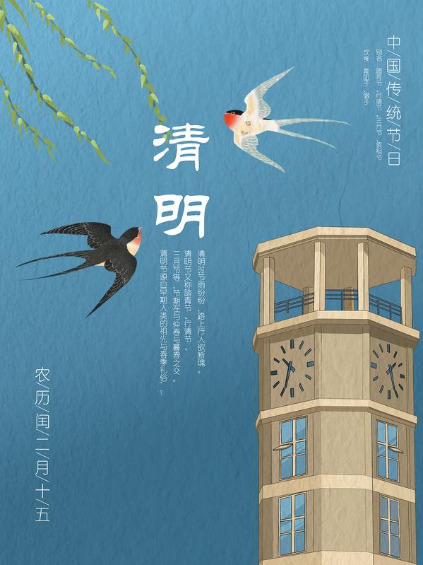 清明,是中国二十四节气中的第五个节气,也是诸多节气中唯一一个与传统节日“清明节”重合的节气。“万物生长此时,皆清洁而明净”,所以叫做“清明”。清明有三候:一候桐始华;二候田鼠化为鴽;三候虹始见。清明节兼具自然与人文两大内涵,既是象征物候变化的节气,也是缅怀先人、戴柳踏青的节时。节气的清明,是春耕春种的大好时机。节日的清明,是寄放情感的传统日子。值此清明时节,小说狂人 社团管理中心组织同学们共同创作了“我们的节日·清明”系列海报,为这个特殊的节气又增添了一丝艺术气息。