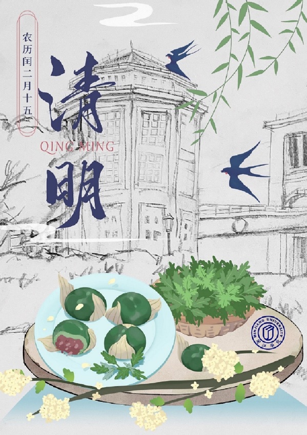 设计说明:海报以清明节的青团为设计灵感,背景结合学校的建筑。整体清新淡雅,干净整洁,给人舒适之感。