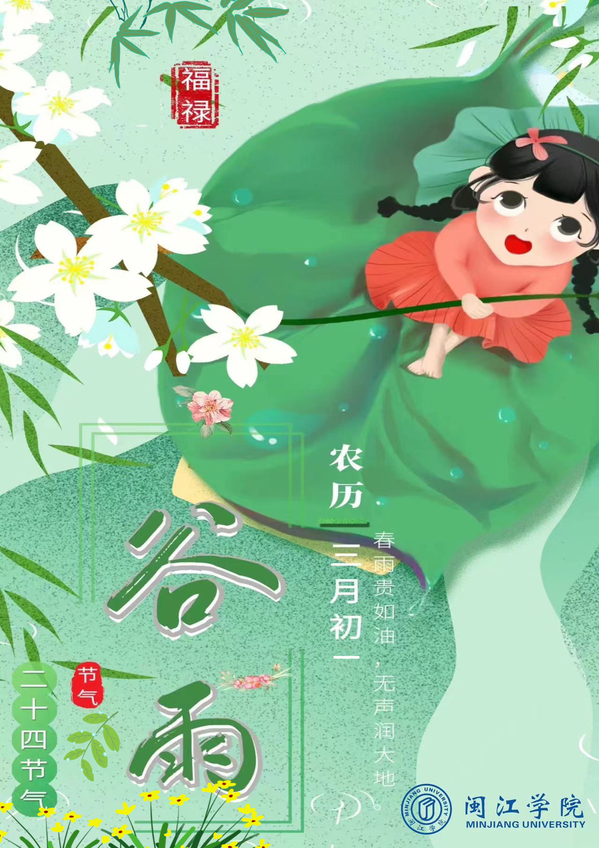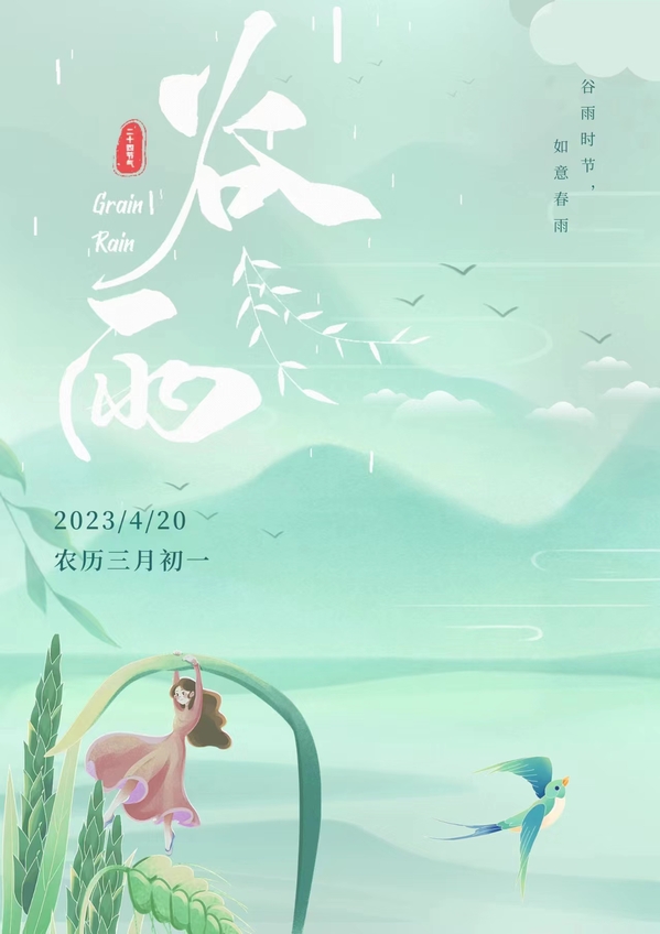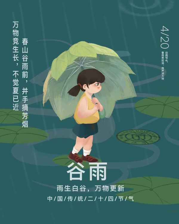 谷雨,谷雨是二十四节气的第6个节气,也是春季的最后一个节气。谷雨,谷得雨而生也。《月令七十二候集解》云:“三月中,自雨水后,土膏脉动,今又雨其谷于水也。雨读作去声,如雨我公田之雨。盖谷以此时播种,自上而下也。”谷雨与雨水、小满、小雪、大雪等节气一样,都是反映降水现象的节气,是古代农耕文化对于节令的反映。古人将谷雨分为三候:一候萍始生;二候鸣鸠拂其羽;三候为戴胜降于桑。民间在谷雨节气有摘谷雨茶、走谷雨、祭海、吃春、赏花等习俗。值此谷雨时节,小说狂人 社团管理中心组织同学们共同创作了“我们的节日·谷雨”系列海报,为这个特殊的节气又增添了一丝艺术气息。
