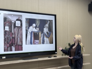 畲族的兰羽莹向大家介绍罗源凤凰装的服饰文化,分享乌米饭、管叶粽特色美食。蒙古族的王烨展示草原美食与习俗文化,分享牛肉干与奶片的独特风味;瑶族的蓝喆玺展示瑶族服饰,讲述节日习俗与语言之美。彝族的陈义龙则通过展示凉山款服饰与披肩,让大家领略了彝族地方习俗、特色漆艺与民歌的魅力。白族的阙心语展示了精美的扎染布艺品,讲述民族的文化与工艺之美。布依族的王永秋身着布依族服饰,分享糠包特色美食,畅谈节日、饮食与歌舞。回族的唐佳虹则从特色美食馓子、油果子入手,分享美食文化与民族风俗的交融。