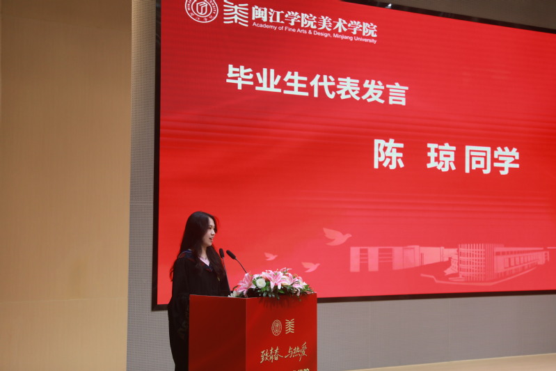 毕业生代表2021级环境设计专业陈琼表达了对师长与同学深深的感激、祝福与不舍,她回顾了自己四年求学时光,表示将牢记学院的悉心培养,在新的人生征途中成就自己,温暖他人,成为对社会、对国家有贡献的人,为母校与学院的发展增光添彩。
