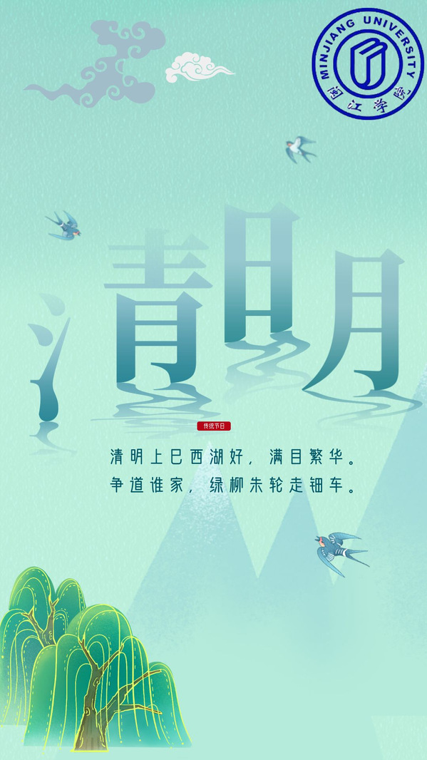 清明,是中国二十四节气中的第五个节气,也是诸多节气中唯一一个与传统节日“清明节”重合的节气。“万物生长此时,皆清洁而明净”,所以叫做“清明”。清明有三候:一候桐始华;二候田鼠化为鴽;三候虹始见。清明节兼具自然与人文两大内涵,既是象征物候变化的节气,也是缅怀先人、戴柳踏青的节时。节气的清明,是春耕春种的大好时机。节日的清明,是寄放情感的传统日子。值此清明时节,小说狂人 社团管理中心组织同学们共同创作了“我们的节日·清明”系列海报,为这个特殊的节气又增添了一丝艺术气息。