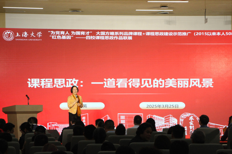特约嘉宾上海大学教务部副部长顾晓英教授作了主旨发言,顾晓英认为,四校课程思政作品展是交流与融合的平台,可以通过共同开发课程,打造联合线上课程,各校学生合作完成大型的艺术作品,深化课程思政育人实效。她分享了“12344”课程思政建设体系的上大风景,包括分层分类-新思想点亮的专业教育育人风景以及“红色项链”-串联高校党史类课程联盟风景的宝贵经验。