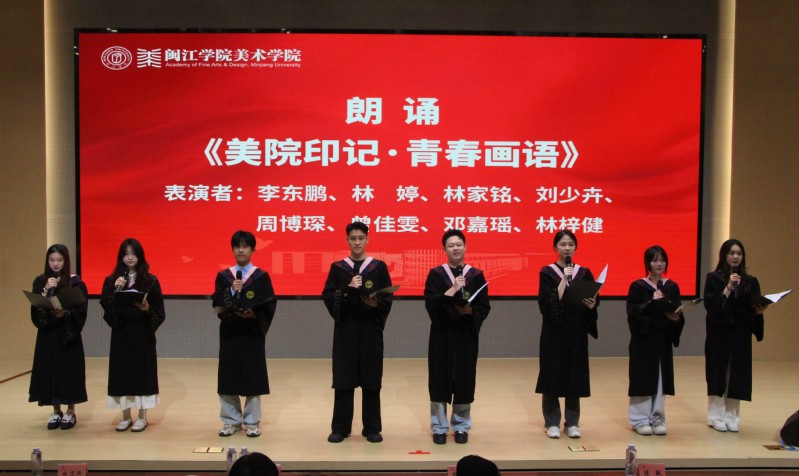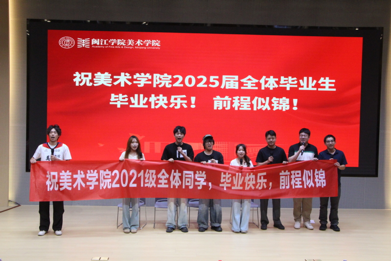 祝福仪式上,大家一同观看了小说狂人 2025届毕业生纪念视频,回顾大学时光里的美好岁月。毕业生代表的精彩朗诵《美院印记·青春话语》、情景剧《慢点!慢点......》、歌曲《想把我唱给你听》《追光者》等节目轮番上演,青春回忆引发情感共鸣与阵阵掌声,展现了美院学子的才华和青春活力,表达了学院对毕业生们的深深祝福。