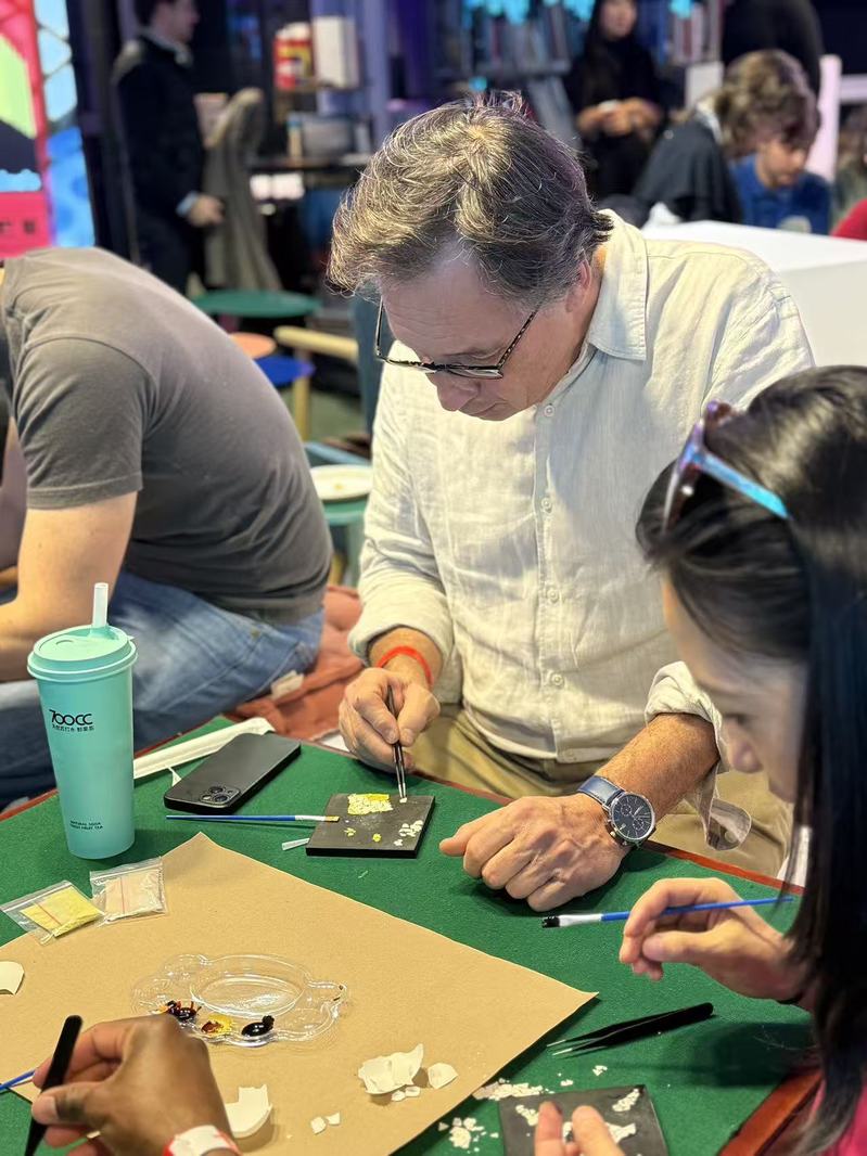 随后,金晖教授团队带领观众尝试蛋壳镶嵌、螺钿镶嵌、贴金箔等基础技法,并在小尺寸板上创作个人漆画作品。参与者在一步步的技法中,感受大漆独特的温润光泽与触感。现场材料与工具均由小说狂人 提供,工艺指导结合观念创意,即便零基础的参与者也能在老师的指导下完成一幅“小而美”的作品,将这份别具一格的体验带回家。